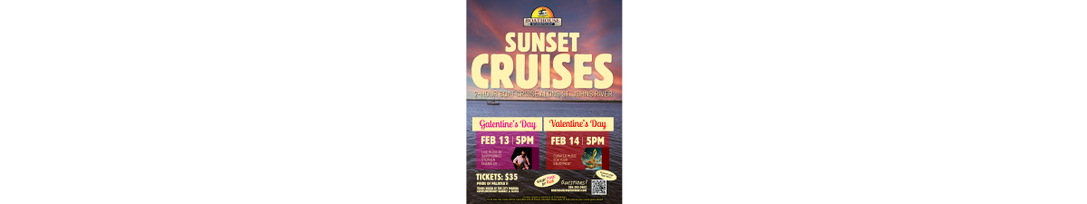 Join us for a scenic cruise on the St. Johns River. Guests can expect a laid-back and fun Galentine's boat ride made for guests 21 and over who just want to relax and enjoy good company, the cruise, and a complimentary glass of bubbly! A live saxophone player will join us to provide easygoing background music that's perfect for chatting, laughing, and unwinding with friends. There's no pressure to dress up or be fancy--just come as you are, bring your favorite people, and enjoy a memorable night on the water celebrating friendship.