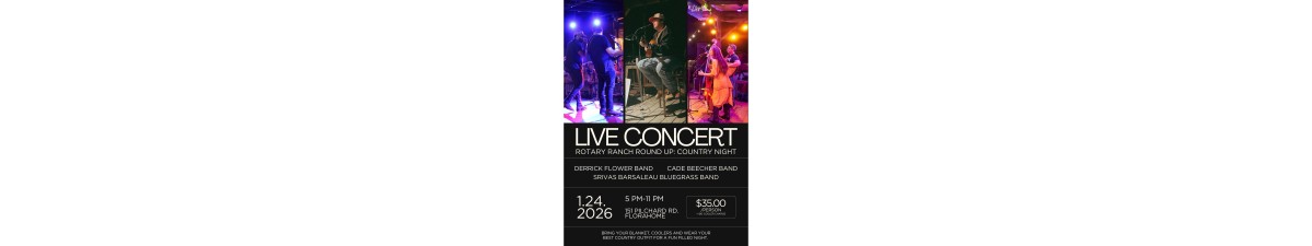 Live concert with performances by: Derrick Flowers Band, Cade Beecher Band, and the Srivas Barsaleau Bluegrass Band. Bring your blanket, coolers, and wear your best country outfit for a fun filled night!